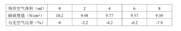 通过实验表明,油缸中残存空气量对耐破度值的影响如下表:
